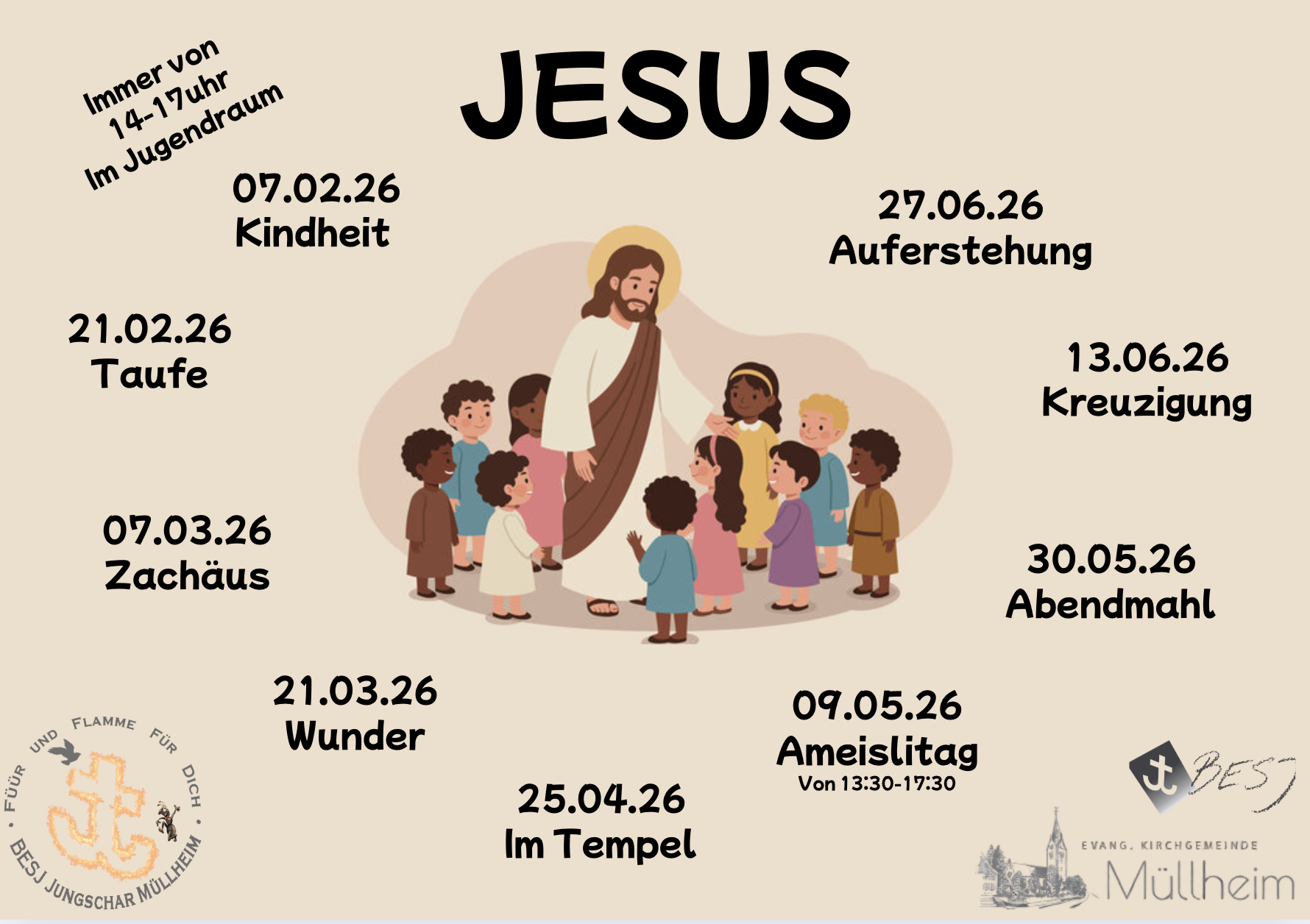 Wir sind ein Teil der Kinder- und Jugendarbeit der Evangelischen Kirchgemeinde Müllheim und sind dem Bund Evangelischer Schweizer Jungscharen, kurz BESJ , angeschlossen. Wir treffen uns im Normalfall jeden zweiten Samstagnachmittag vor dem Jugendraum in Müllheim, der sich direkt unterhalb der Kirche befindet.